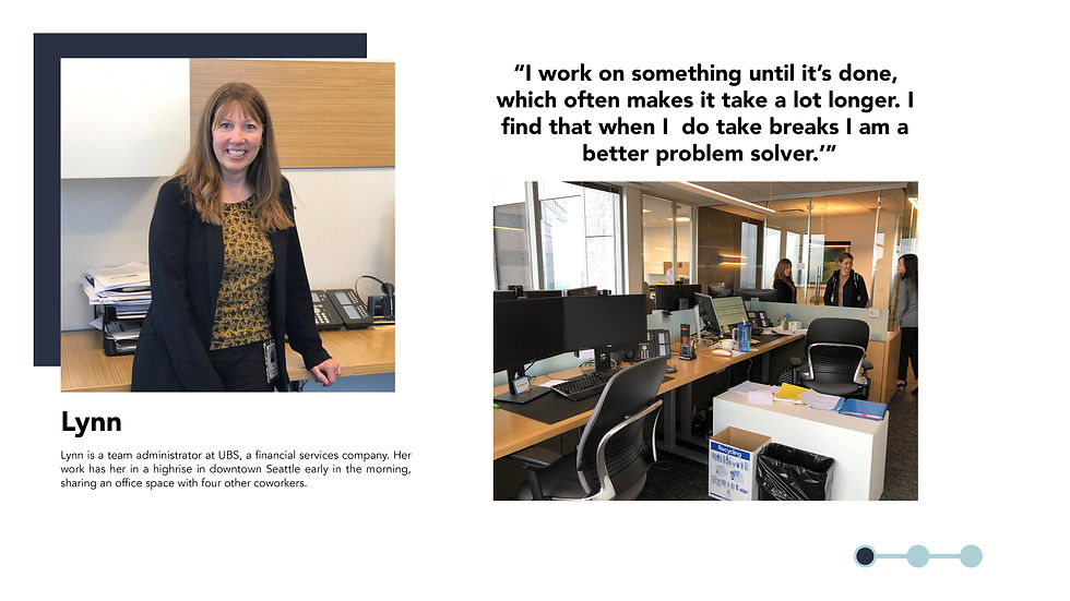 Working in an office has various stressors. It’s important to be able to take a break from your work for one's mind, body and productivity. Our goal is to better understand how employees engage with their office environment in order to design a solution that allows them to find some a way to relax in their work environment .